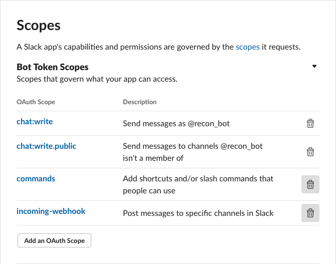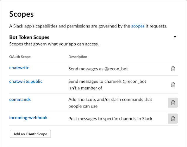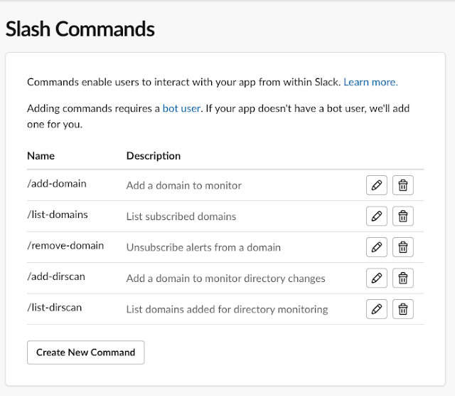 - Now we have to add "Slash commands" for the bot, so that we can add, remove or monitor domains by simply sending messages to the bot using Slack itself. Go to the "Slash Commands" section in app settings, and add commands like shown below: