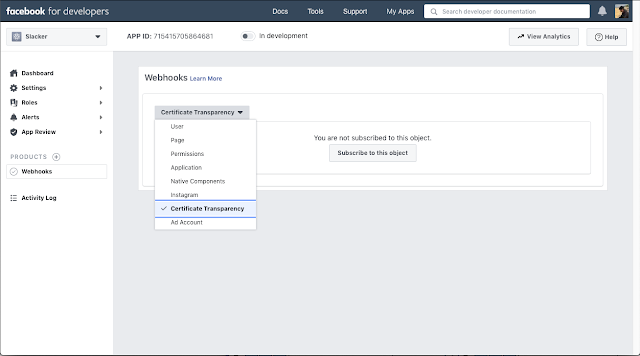 /subdomain-alert (remember to run listener.py on your server first) and a random value for the "Verify Token" field. You should now be able to save this subscription. - In order to receive alerts for real websites, you need to take your app Live. To do this, go to Settings > Basic, and enter the required details. To create a Privacy Policy URL for a website go to https://app.freeprivacypolicy.com/builder/start/free-privacy-policy, and copy the generated link from there. After this, you should be able to take your app live.
