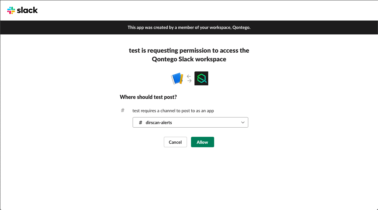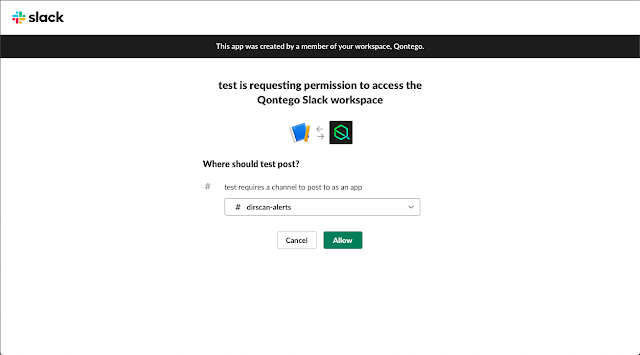 - Now we need to add an incoming webhook. So on the left hand side again, go to the "Incoming Webhooks" option, and add a webhook for the #dirscan-alerts channel, as shown below. Note down the webhook URL.