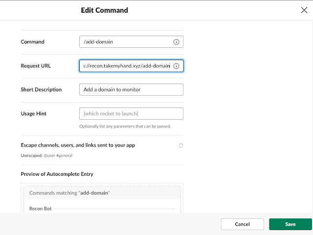 /{command-name} . That is, for the "/add-domain" command, your request URL will be https://recon.takemyhand.xyz/add-domain, as shown: