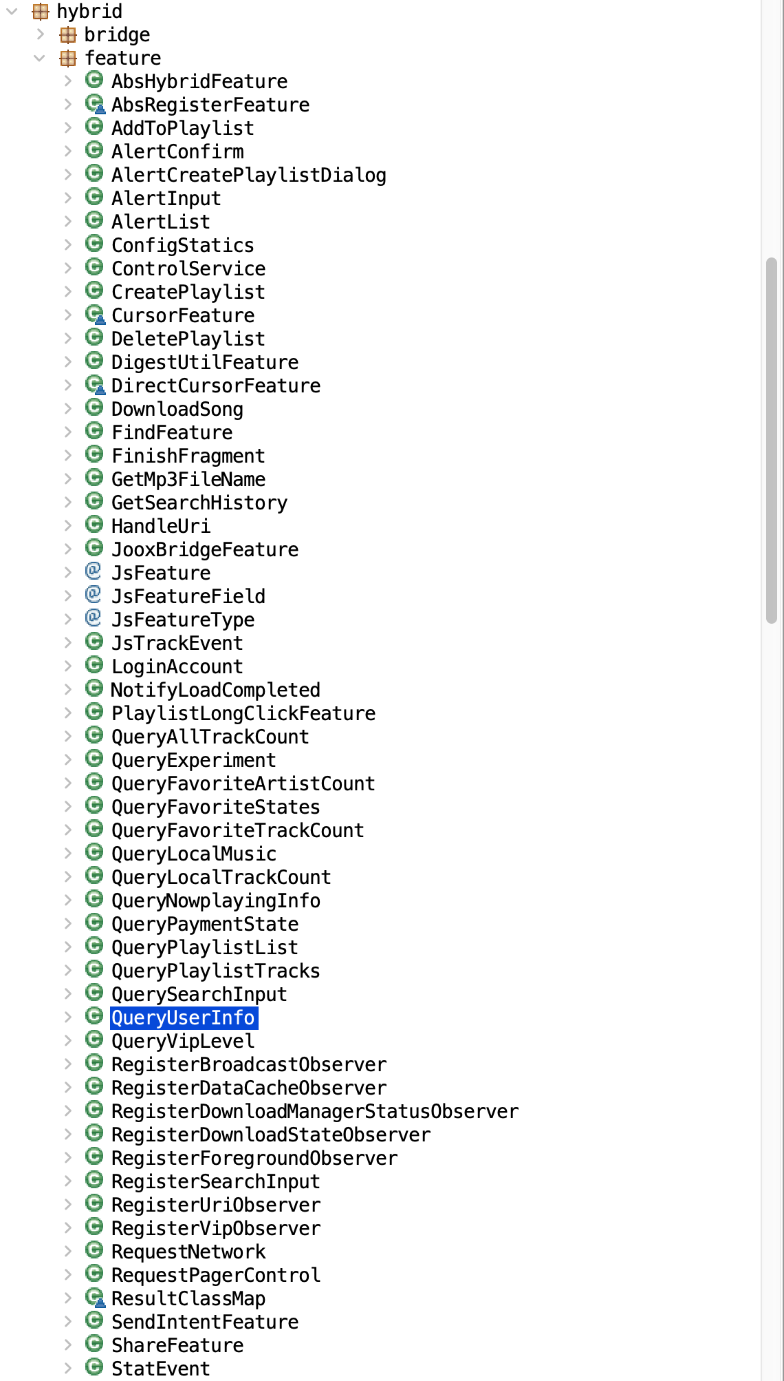 The HybridFeature lookupFeature = this.mFM.lookupFeature(str); allows us to call certain features. A list of all these features can be found under com.miui.player.hybrid.feature folder.
